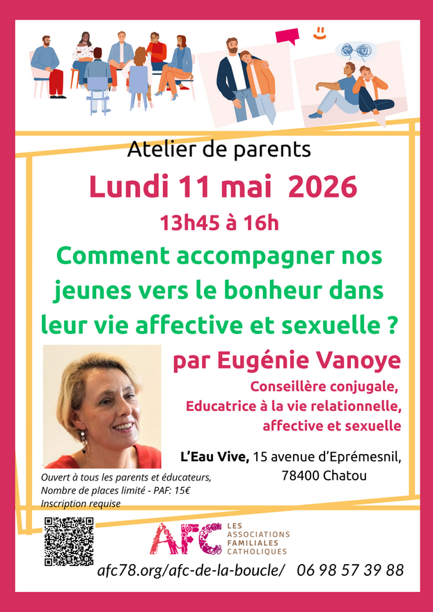 Un moment pour comprendre, échanger et repartir mieux outillés Inscrivez-vous ! https://www.billetweb.fr/comment-accompagner-nos-jeunes-vers-le-bonheur-dans-leur-vie-affective-et-sexuelle Nombre de places limité Contact: 06 98 57 39 88 – afc78chatou@afc-france.org